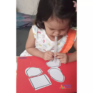 sambil ajak si kecil untuk menyebutkan bentuk-bentuk yg dia gunting✔ Tata potongan kertas geometri di atas meja lalu minta si kecil untuk memindahkan kertas tersebut dgn menggunakan sedotan ke nampan berisi air. Jika kesulitan, beri contoh cara menyedot dan meniupkan kertas tersebut.